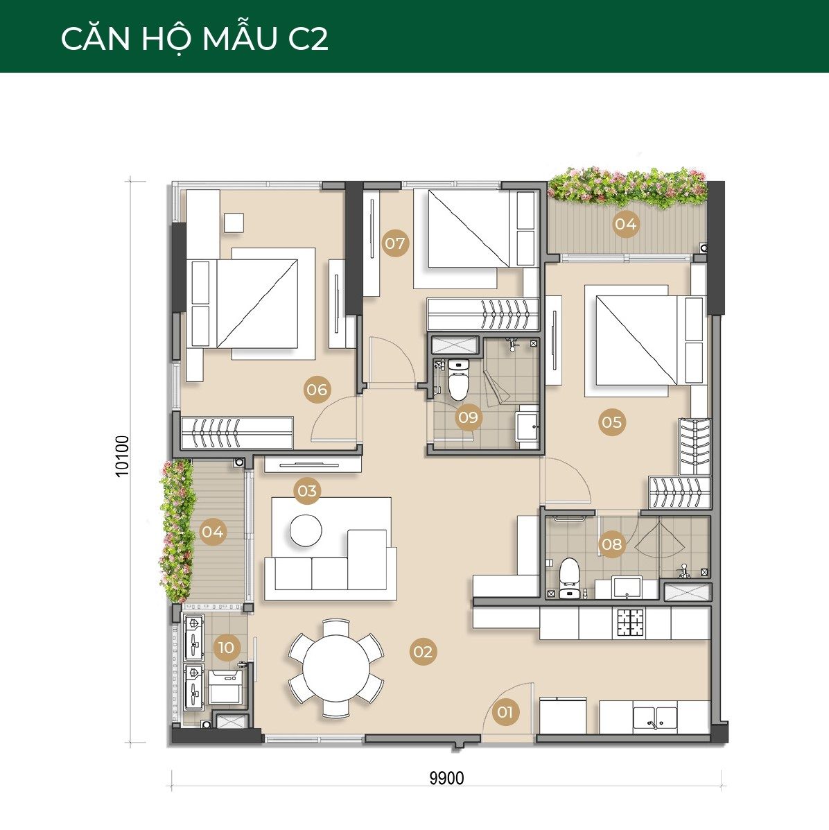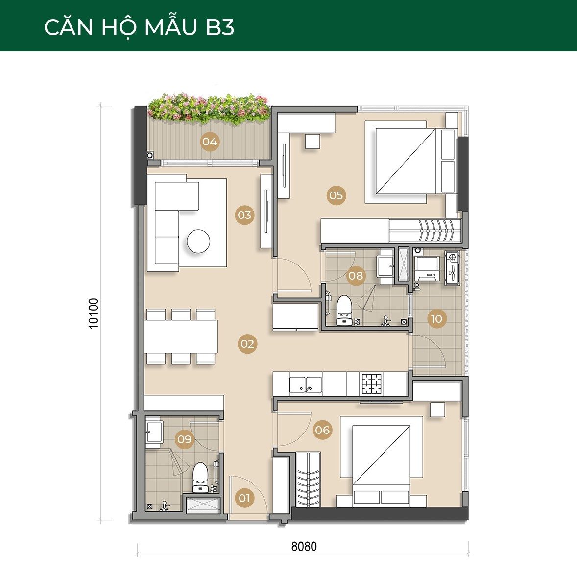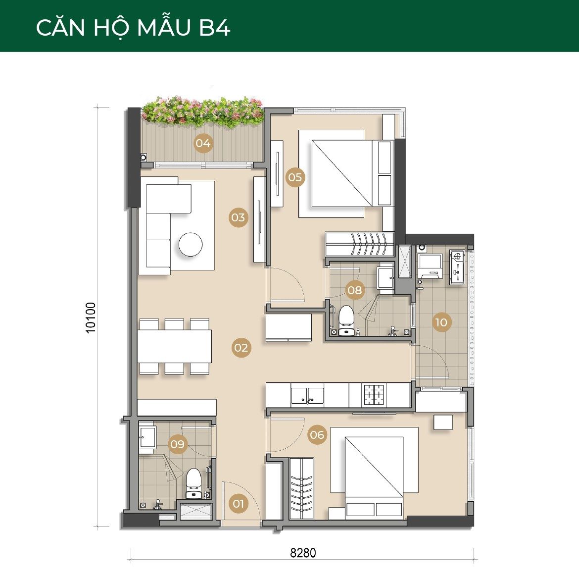 - 817 căn hộ 2-3 phòng ngủ (diện tích 59-106m2)